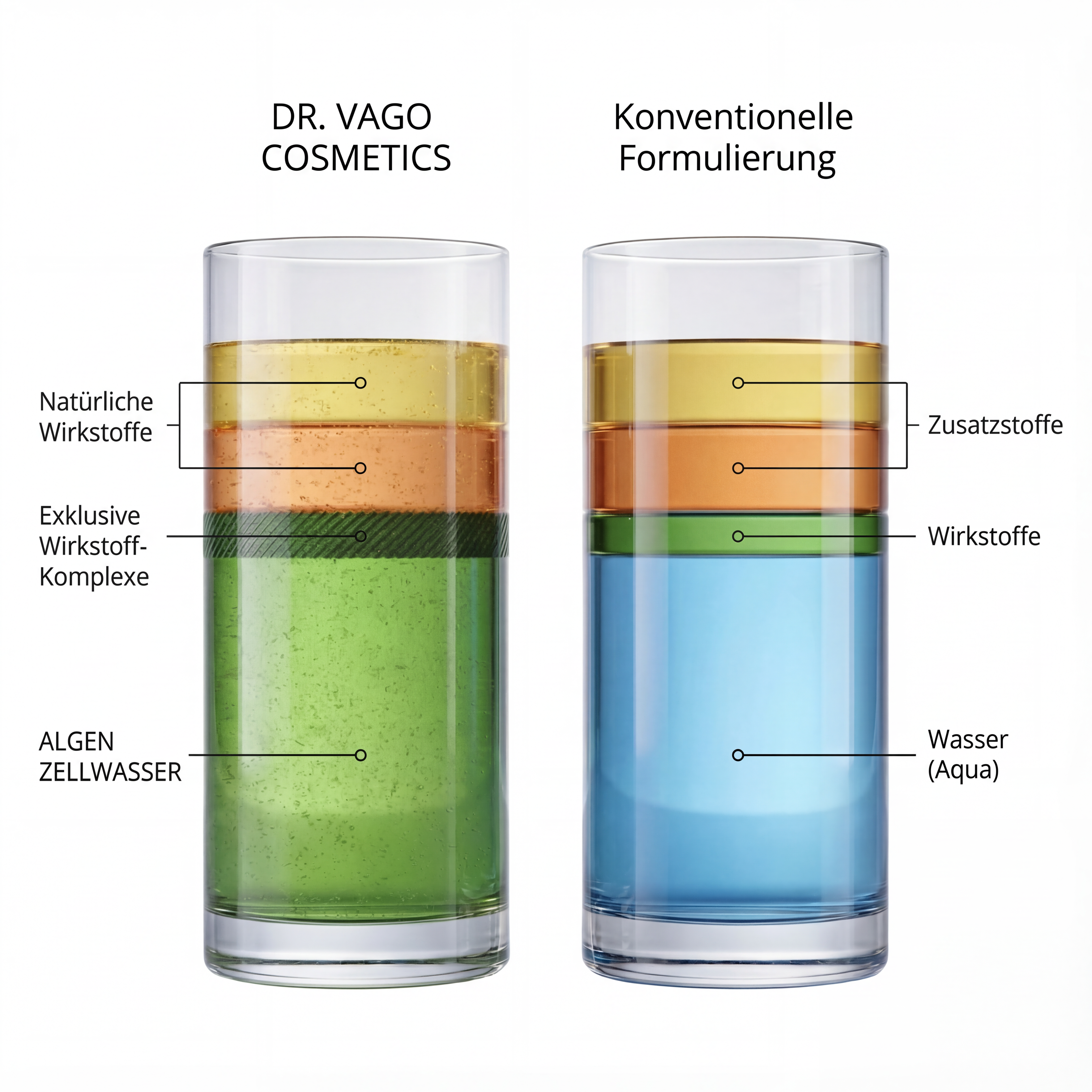 Während herkömmliche Kosmetik oft auf einfachem Wasser basiert, ersetzen wir dieses komplett durch reines Algenzellwasser. Das bedeutet: Eine 100% aktive Wirkstoff-Basis ohne leere Füllstoffe – für maximale Effizienz ab dem ersten Tropfen.